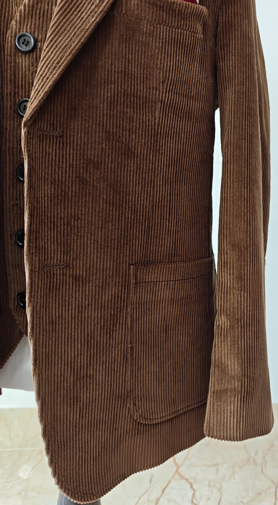 TThe Brown Corduroy 3 Piece Suit brings warmth, texture, and vintage charm together in a refined, modern silhouette. Made from structured corduroy with pronounced vertical ridges, the fabric offers depth and character while maintaining a clean, tailored presence - perfect for autumn and winter styling. The jacket features a classic two-button closure with crisp, balanced lines, paired with patch pockets that add a relaxed yet sophisticated touch. The matching waistcoat enhances the cohesiveness of the ensemble, offering versatility whether worn as a complete three-piece set or styled separately for smart-casual occasions. A coordinating bow tie reinforces the suit’s sense of ceremony, making it an excellent choice for weddings, seasonal events, and elegant evening gatherings. The rich brown tone brings a natural warmth to the look, creating a soft contrast with the corduroy’s texture. Under light, the fabric shows subtle shifts in depth and color, giving the suit an expressive, distinguished personality. Timeless, confident, and full of character—the Brown Corduroy 3 Piece Suit is made for those who want classic tailoring with a bold, textured twist.