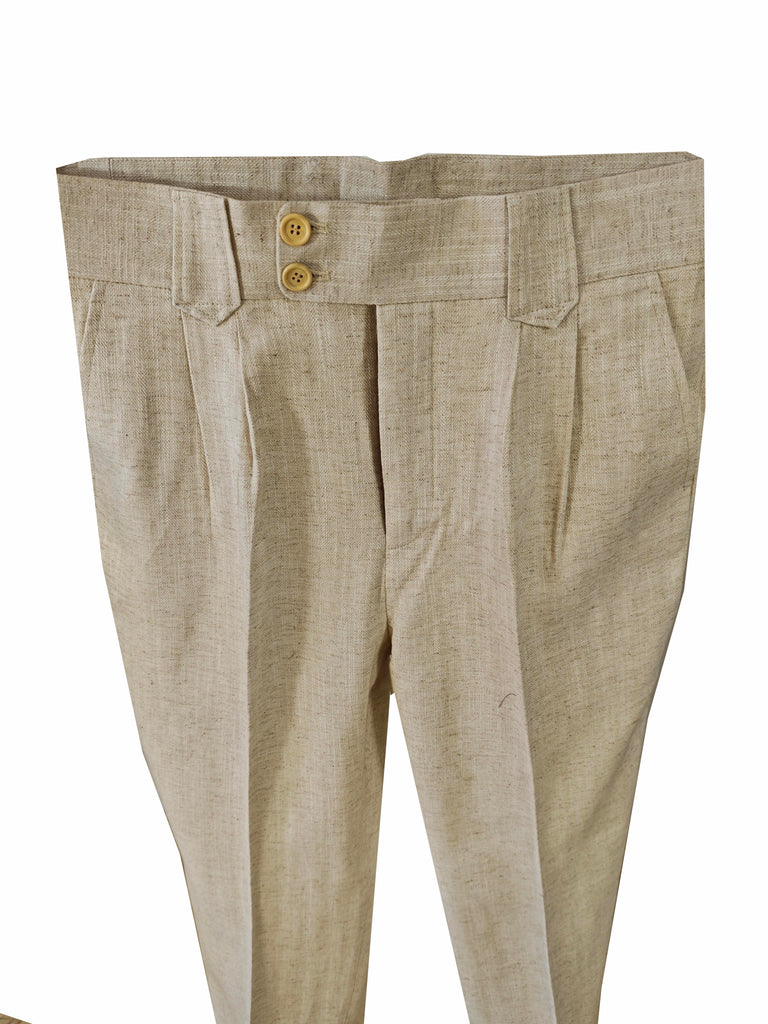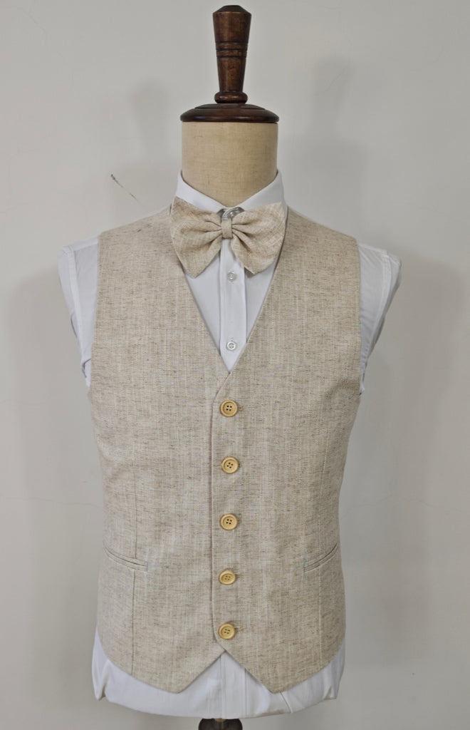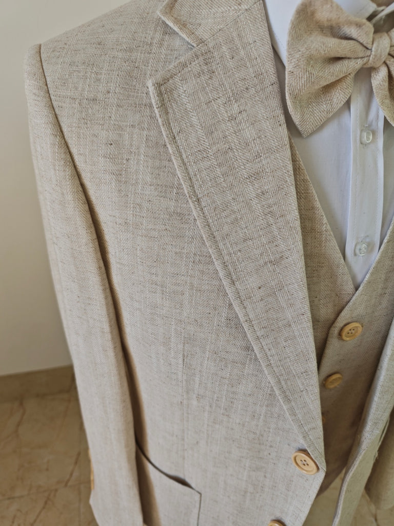Beige Herringbone Cotton-Linen 3 Piece Suit – Neapolitan Style Inspired by the timeless elegance of Southern Italy, this Beige Herringbone Cotton-Linen 3 Piece Suit is crafted in the classic Neapolitan style. The lightweight cotton-linen blend offers breathability, softness, and a relaxed natural drape, making it perfect for warm-weather occasions. The beige tone paired with a subtle herringbone texture creates a refined and sunlit aesthetic that feels both relaxed and sophisticated.