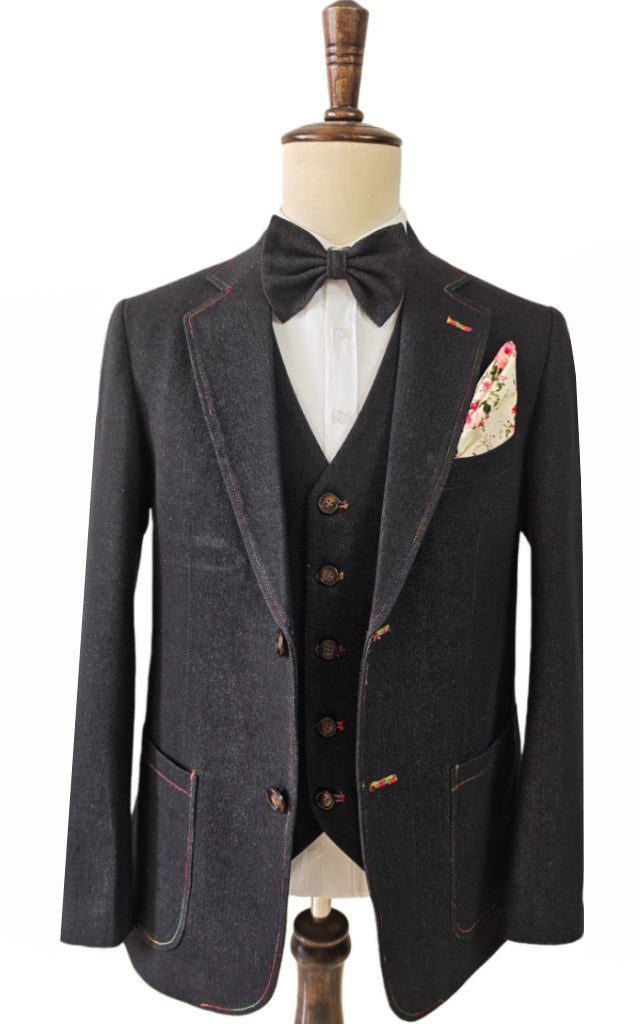 This is Black Denim 3 piece Suit blends formality with effortless ease. Crafted from deep black denim, it carries a naturally relaxed vibe while still maintaining the clean structure and silhouette of a well-made suit. Whether it’s a weekend gathering, a business-casual setting, or simply a day you want your style to stand out, this suit fits right in—no overthinking required. The jacket’s patch pockets, soft natural shoulders, and denim texture create a laid-back feel, while the waistcoat and trousers keep the look sharp and well-balanced. Color-accented hand-stitched buttonholes and contrast stitching add a subtle touch of personality throughout the design. This black denim 3-piece suit isn’t about being overly formal. It’s about staying comfortable, confident, and stylish—with a casual attitude that still looks perfectly put-together.