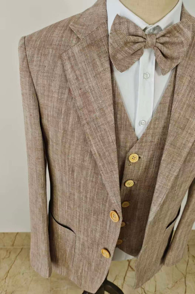 Light Brown Herringbone Cotton Linen 3 Piece Suit – Neapolitan Style The Light Brown Herringbone Cotton Linen 3 Piece Suit brings a warm, sunlit interpretation of classic Neapolitan tailoring. The light brown tone delivers a natural, earthy elegance that feels relaxed yet refined, making it an ideal choice for warm-weather occasions. Combined with the subtle herringbone texture, the suit carries a soft Mediterranean charm, reminiscent of sunny streets, open-air gatherings, and effortless Southern European style.
