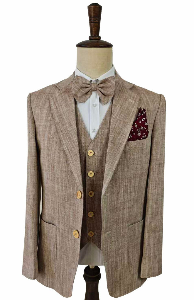 The matching vest maintains visual harmony across the three-piece design while adding structure and balance to the overall look. A pocket square in deeper earthy or burgundy tones pairs beautifully with the light brown fabric, introducing contrast that complements the warm palette and elevates the ensemble. This suit is perfect for beach weddings, garden ceremonies, outdoor parties, holiday celebrations, and modern casual-formal settings where warmth, natural texture, and relaxed elegance are appreciated. The light brown tone gives the suit a charming versatility, allowing it to shift easily between refined sophistication and laid-back Mediterranean style.