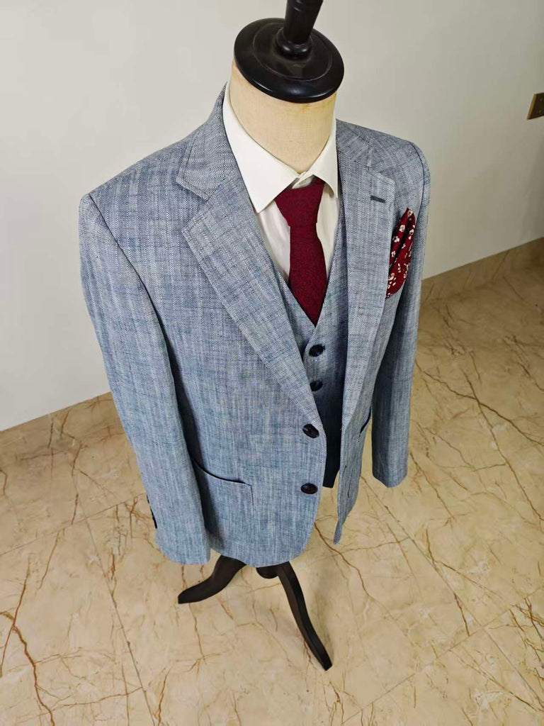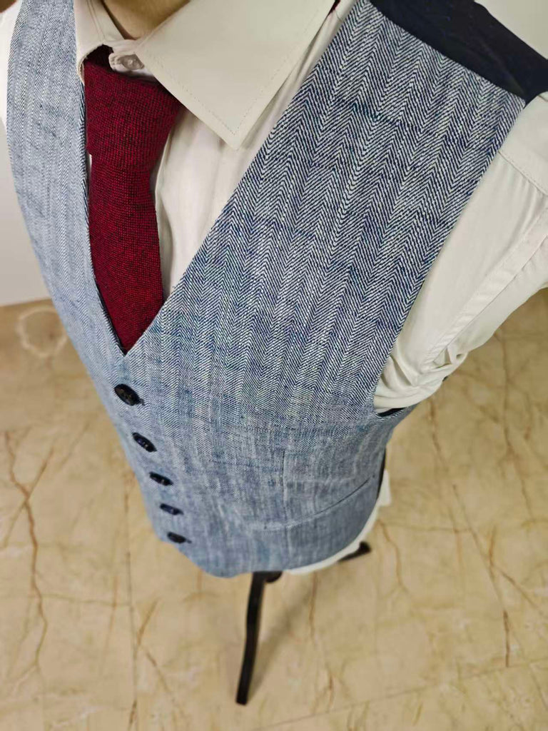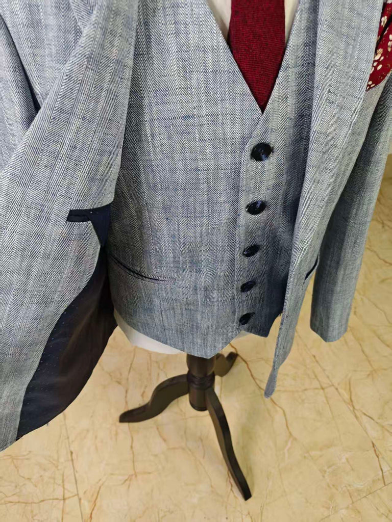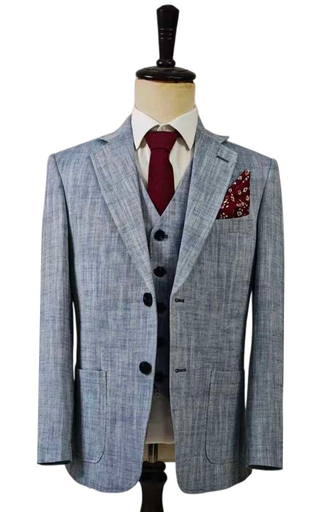 This light blue herringbone three piece suit is crafted from a premium cotton-linen blend, offering a breathable, lightweight, and naturally textured feel. Designed for spring and summer, it combines comfort with refined elegance. The subtle herringbone weave adds depth and sophistication, while the soft light-blue tone creates a clean and refreshing look. Perfect for business meetings, summer weddings, or smart casual occasions, this suit allows you to move effortlessly between formality and relaxation — embodying both modern craftsmanship and timeless gentleman style.