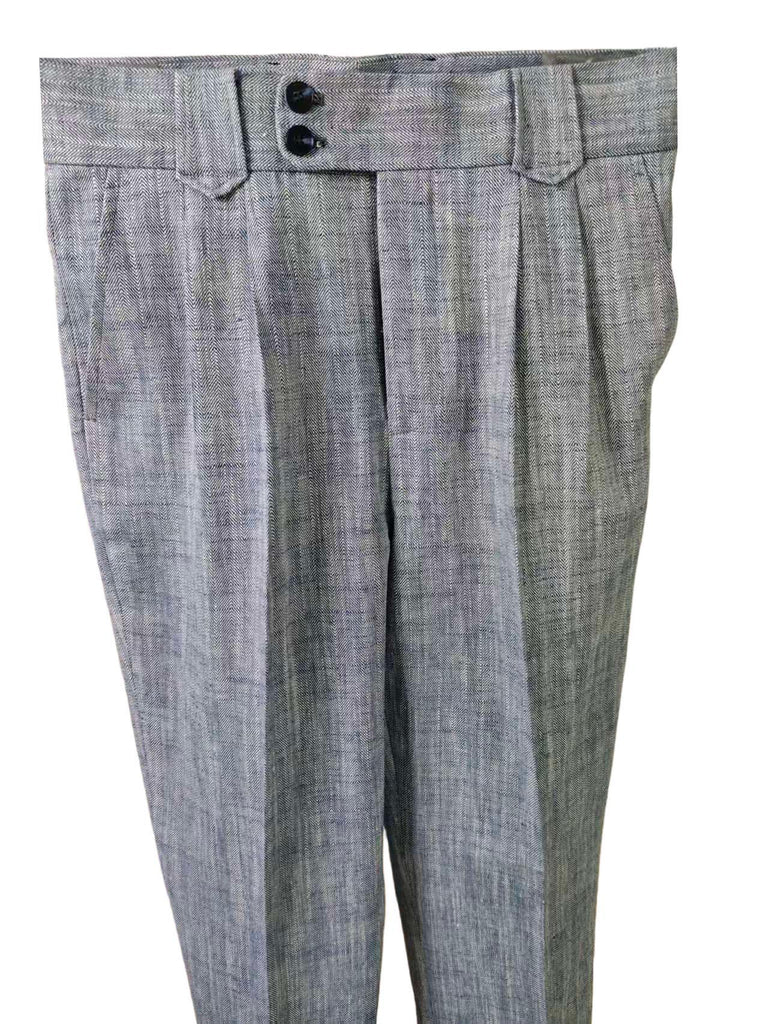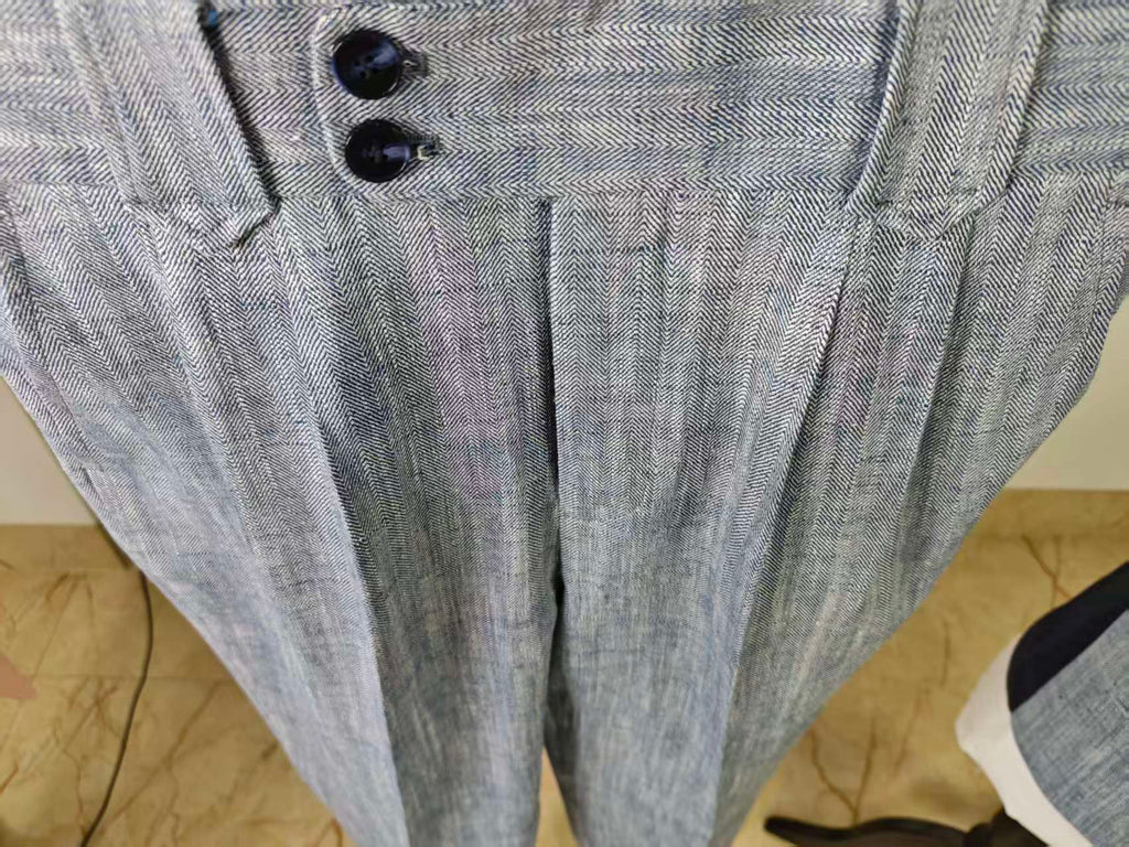 - The trousers have two pleats. the leather belt loops on the front of the pants have been personalized.