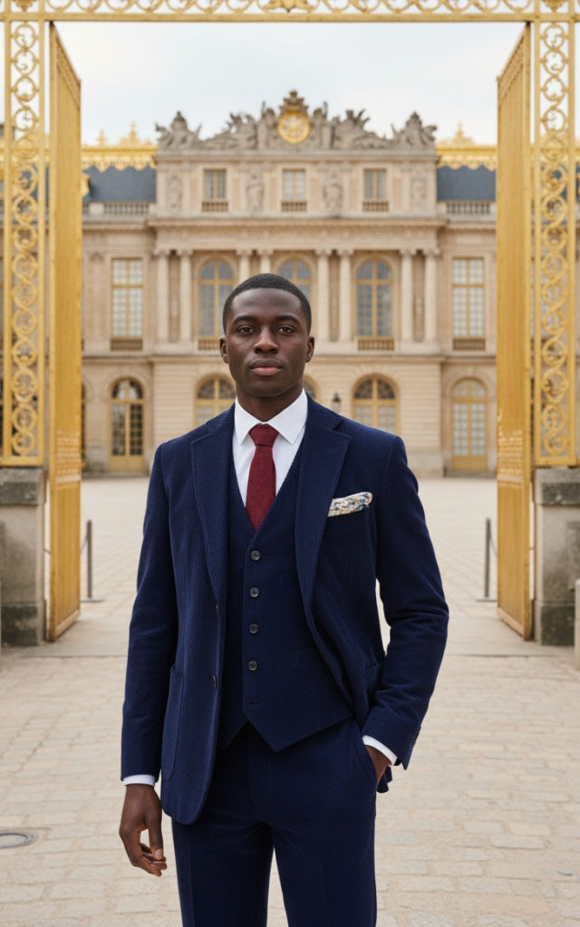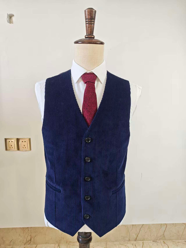 The Navy Corduroy 3 Piece Suit brings warmth, and vintage charm together in a refined, modern silhouette. Made from structured corduroy with pronounced vertical ridges, the fabric offers depth and character while maintaining a clean, tailored presence - perfect for autumn and winter styling. The jacket features a classic two-button closure with crisp, balanced lines, paired with patch pockets that add a relaxed yet sophisticated touch. The matching waistcoat enhances the cohesiveness of the ensemble, offering versatility whether worn as a complete three-piece set or styled separately for smart-casual occasions. A coordinating bow tie reinforces the suit’s sense of ceremony, making it an excellent choice for weddings, seasonal events, and elegant evening gatherings. The rich brown tone brings a natural warmth to the look, creating a soft contrast with the corduroy’s texture. Under light, the fabric shows subtle shifts in depth and color, giving the suit an expressive, distinguished personality. Timeless, confident, and full of character—the Navy Corduroy 3 Piece Suit is made for those who want classic tailoring with a bold, textured twist.