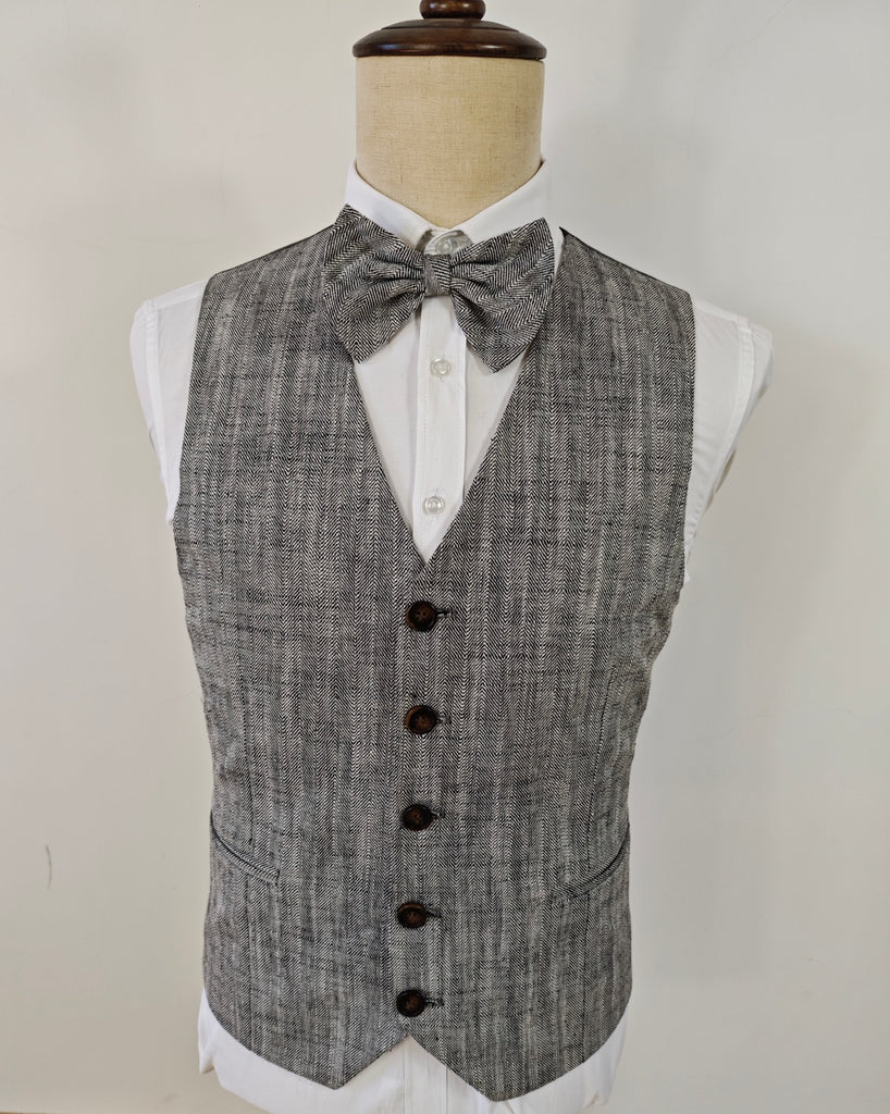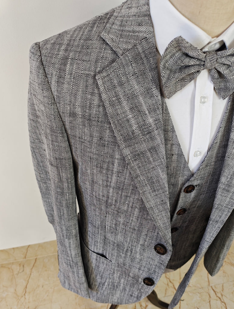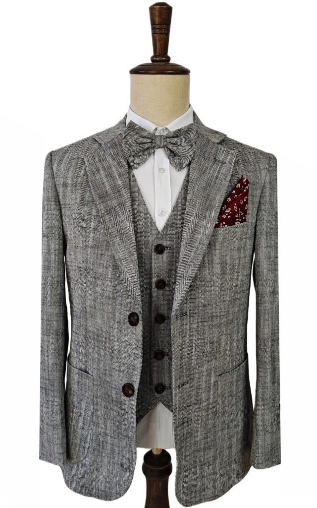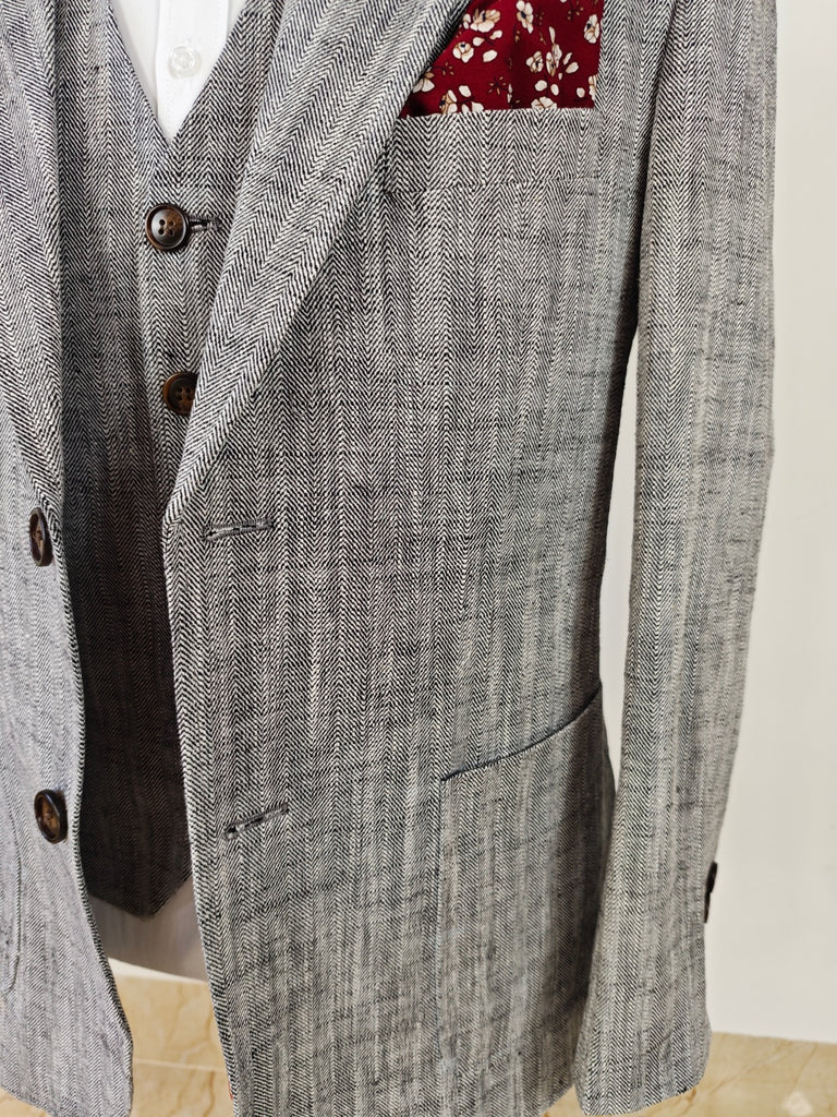 Light Gray Herringbone Cotton Linen 3 Piece Suit – casual Style This Light Gray Herringbone Cotton Linen 3 Piece Suit brings a fresh, airy interpretation of classic casual tailoring. The light gray tone gives the suit a clean and modern presence, offering a cooler, more refined visual effect compared to warmer beige shades. Combined with a subtle herringbone texture, the suit presents a calm, elegant character that feels effortless and naturally sophisticated.