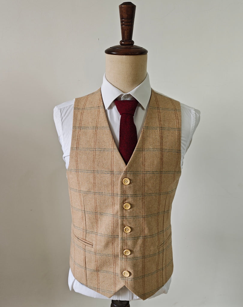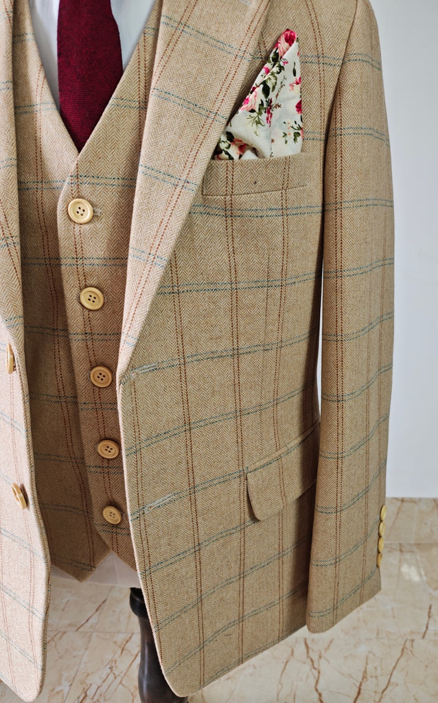 Elegant yet approachable, the Beige Herringbone Plaid 3 Piece Suit is ideal for business events, weddings, and refined social occasions where subtle style speaks the loudest.