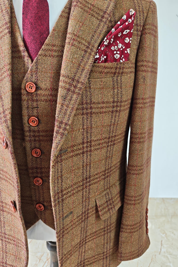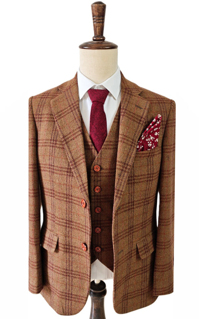 Made from the same premium textured plaid fabric, the Brown Red Plaid 3 Piece Suit presents a richer, warmer color expression with a refined sense of depth. The brown base is accented with subtle red and muted tonal lines, creating a classic plaid pattern that feels timeless yet distinctive.