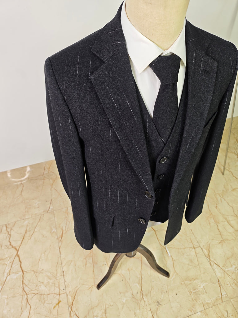 Refined, modern, and effortlessly elegant — this Charcoal Melange Pinstripe 3-Piece Suit is crafted from a premium wool-blend fabric with a subtle textured finish. The mélange weave creates depth and dimension, while the fine pinstripes add a classic touch. Designed with a structured fit, peak lapels, and a matching waistcoat, it’s perfect for formal events, business occasions, or any setting where sophistication is essential.