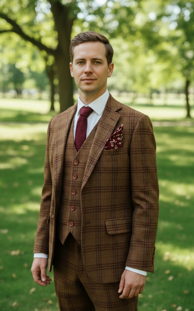 Made from the same premium textured plaid fabric, the Brown Red Plaid 3 Piece Suit presents a richer, warmer color expression with a refined sense of depth. The brown base is accented with subtle red and muted tonal lines, creating a classic plaid pattern that feels timeless yet distinctive.