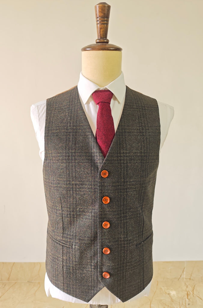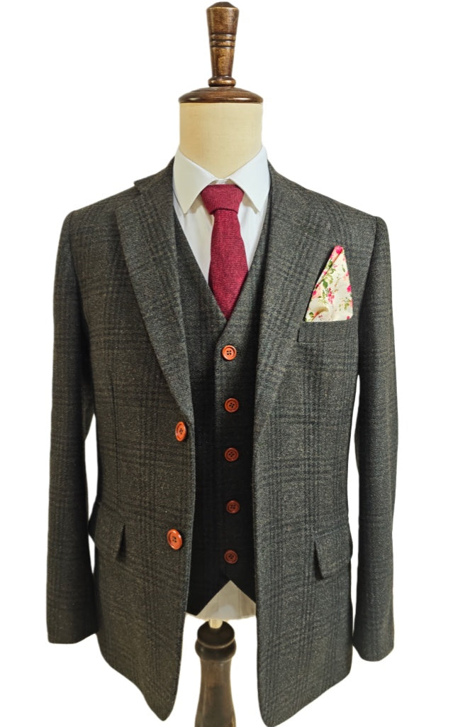 Elevate your wardrobe with this distinguished three-piece suit, featuring a sophisticated green and black overcheck plaid pattern with subtle red accents. Crafted from premium textured fabric, this bespoke ensemble exemplifies timeless British tailoring tradition.